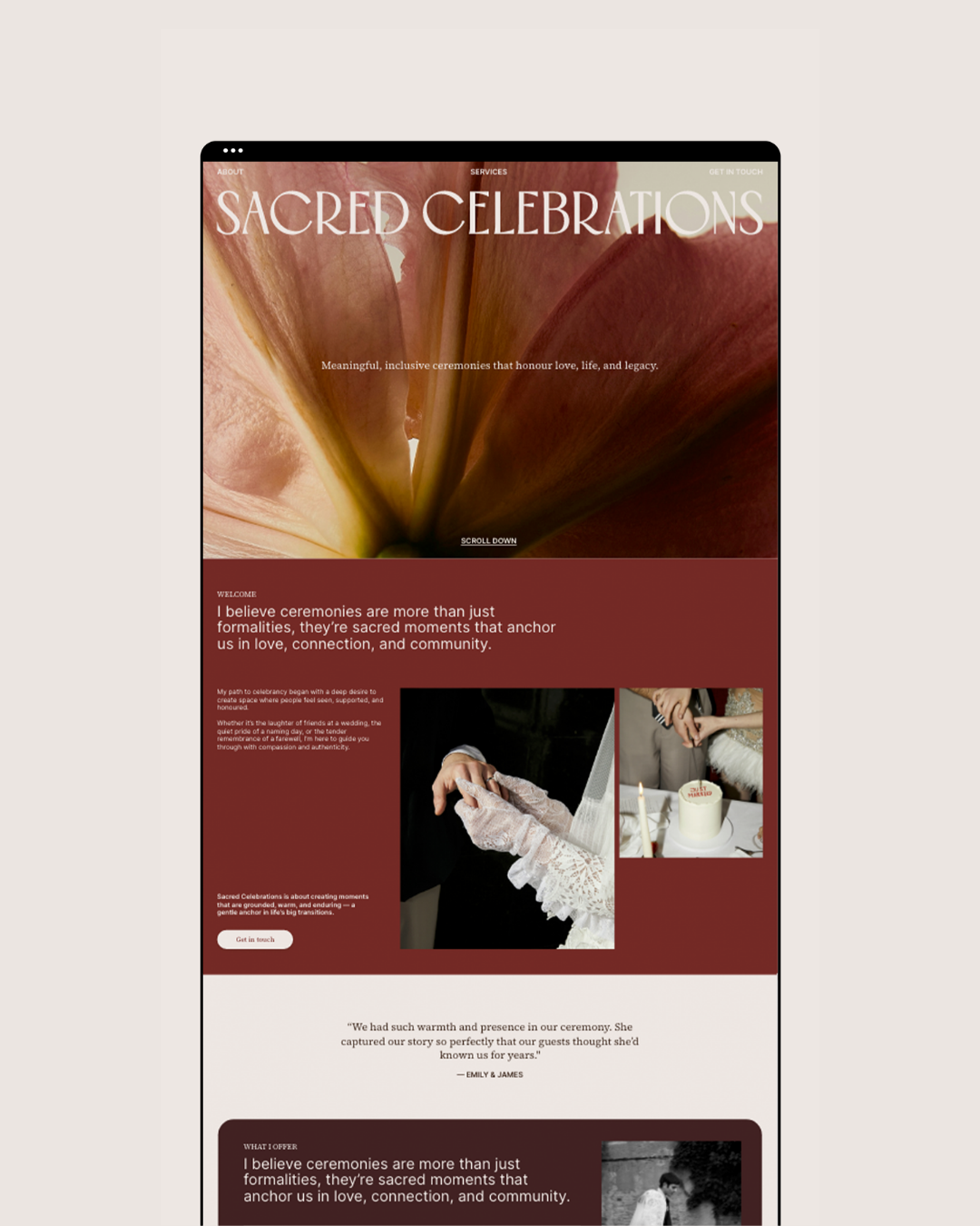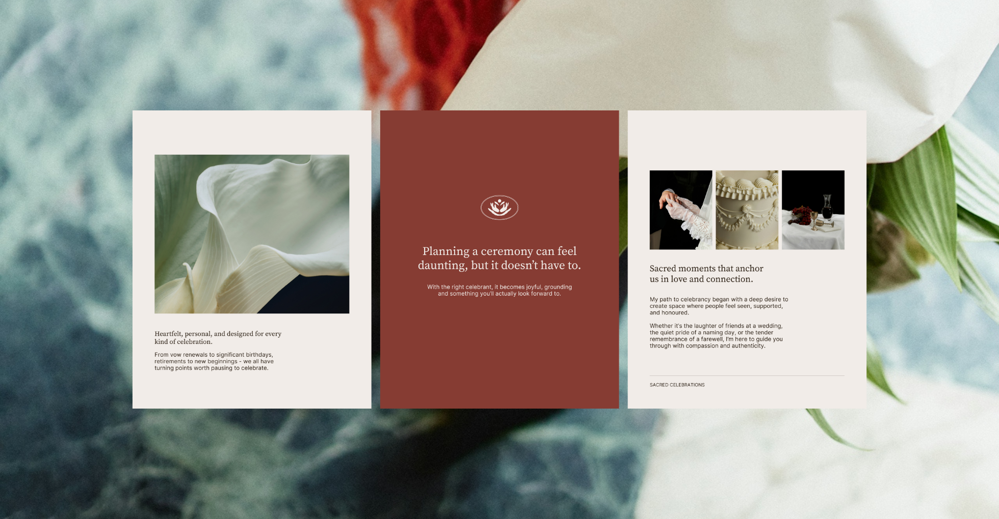 The result is a brand that holds space rather than fills it. Modern, warm, and quietly powerful, Sacred Celebrations reflects the sacredness of connection and the beauty found in moments that truly matter.